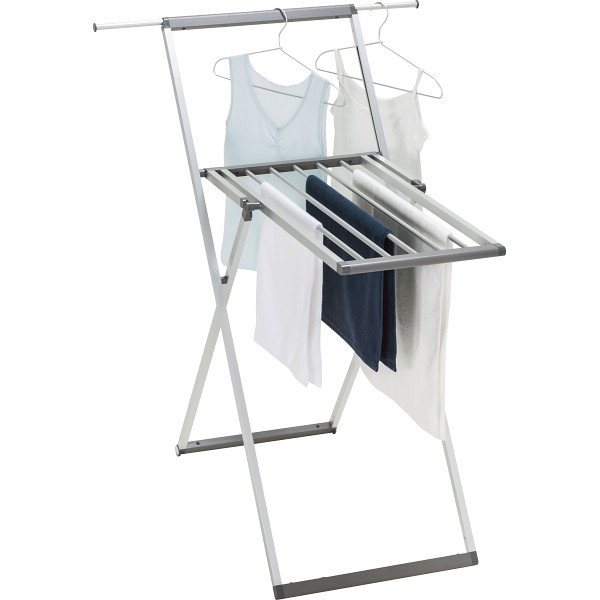 アルミのシックな素材感とシンプルでムダのないフォルムのランドリ-スタンド・バスタオルなど大物からシャツのハンガ-干し、セ-タ-の平干しなど多量の干し物に対応・コンパクトキャスター付きで干したままの移動も簡単・すぐに使える組立て完成品