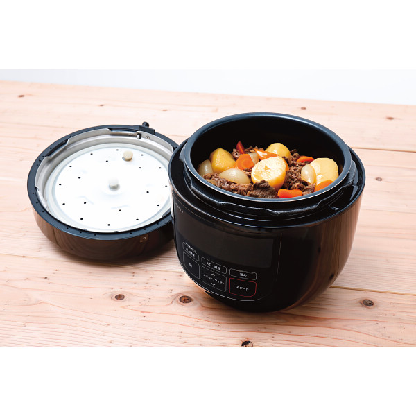 内容:電源=AC100V・消費電力=800W、コード長約1.2m、プリセットメニュー=10、タイマー予約=あり、炊飯=5合まで、使用最大圧力=90kpa、機能=圧力調理、無水調理、蒸し調理、炊飯、スロー調理、発酵、温め直し、付属品=計量カップ、蒸し台、内ふた用パッキン(予備)、レシピブック