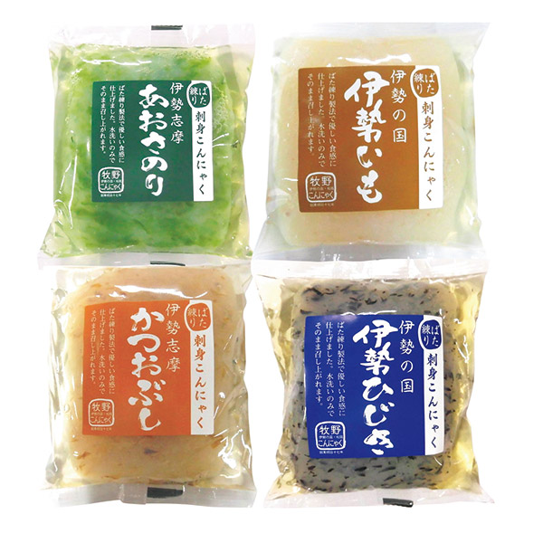 伊勢志摩特産のあおさのり・ひじき・かつおぶし・伊勢いもをそのまま使用した素材感たっぷりのヘルシーな刺身こんにゃくです。からし酢みそなどでそのまま召しあがれます。