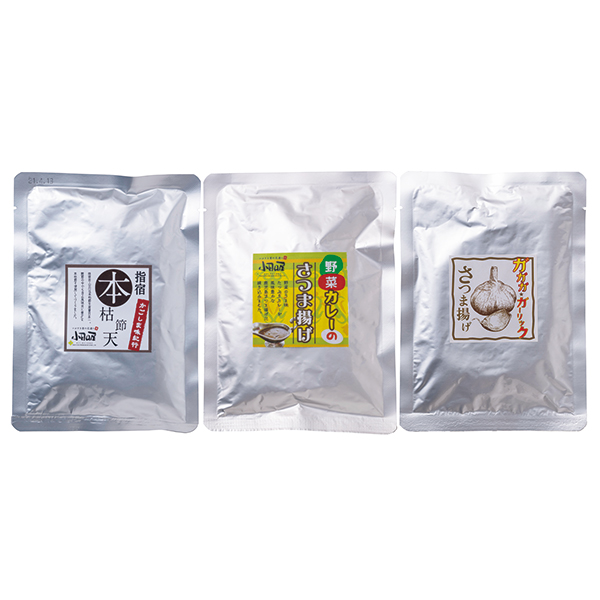 お酒のおつまみやおやつ、お弁当のおかずに便利な常温保存できるさつま揚げ。3種類それぞれの味わいをお楽しみください。