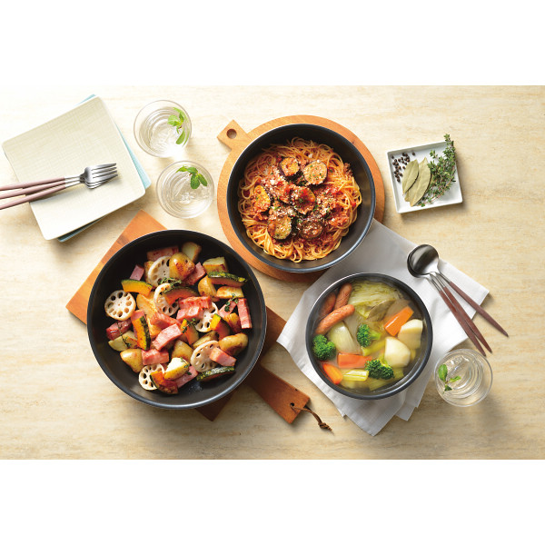 内容:鍋16cm=容量約1.5l(深さ約7.9cm)、フライパン20cm=深さ約4.5cm、フライパン24cm=深さ約5.2cm、ガラス蓋16cm、着脱ハンドル×各1、ガスコンロ可、100・200V電磁調理器対応