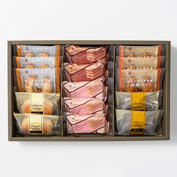 内容:馬蹄パイ(キャラメル・シュガーバター)・ミルフイユ(フランボワーズ)×各3個、ミルフイユ(キャラメルラテ)・スフレ(芳醇フロマージュ・濃厚ショコラ)×各2個
