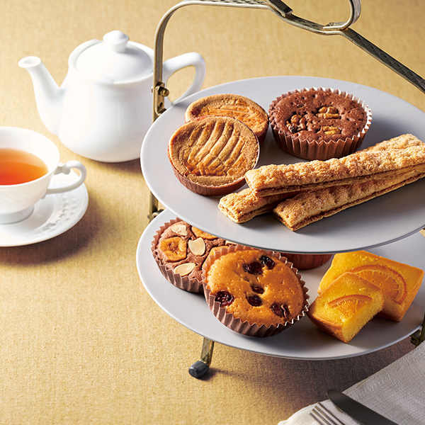 しっとり生地にフルーツやナッツを飾ったプチケーキやオレンジケーキ、さくっとした食感の中にキャラメルの風味が香る少し長いサイズのロングパイ、アーモンドが香ばしく香るフランス伝統の厚焼きクッキーと、ホテルの豊かなティータイムを演出するスイーツを詰め合わせました。