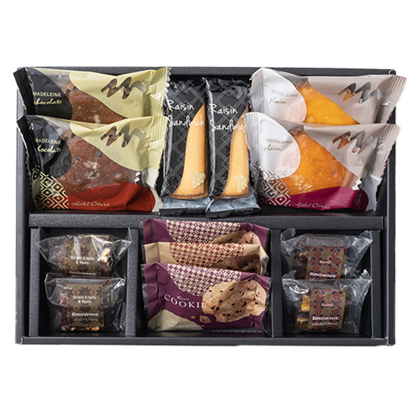 内容:ブラウニーネーブル・レーズンサンド・マドレーヌ(プレーン・チョコ)・チョコレートケーキ・レーズンクッキー×各2個、チョコチップクッキー×1個