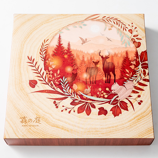 非日常の森の庭で素朴なお菓子を味わう『森の庭』シリーズ。しっとりバームクーヘンにカラメルソースをまとわせ、砂糖をかけてさらに焼き上げた「焦がしキャラメルがしみ込んだバーム」と、「しっとりバームクーヘン」の2種を詰め合わせました。ひと手間かけた味わいをお楽しみください。