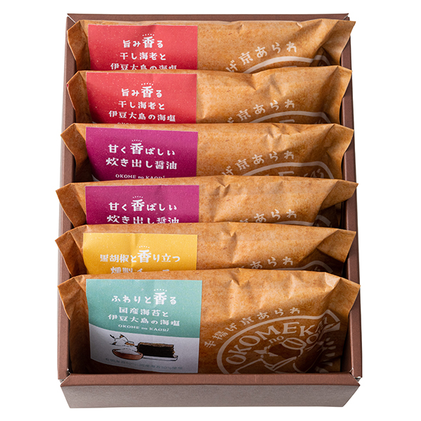 内容:手揚げ京あられ×6袋(旨み香る干し海老と伊豆大島の海塩14g・甘く香ばしい炊き出し醤油15g×各2袋、ふわりと香る国産海苔と伊豆大島の海塩15g・黒胡椒と香り立つ燻製チーズ12g×各1袋)