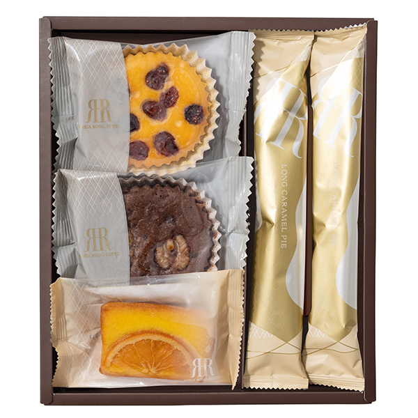 内容:プチケーキ(ベリー・ショコラ&ナッツ×各1個)、オレンジケーキ×1個、ロングキャラメルパイ×2本