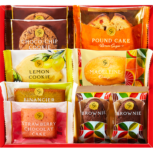 内容:オレンジマドレーヌ×1個、ストロベリーショコラケーキ×1個、ピスタチオフィナンシェ×1個、ブラウニー×2個、ブラウンシュガーパウンドケーキ×1個、チョコチップクッキー×2個、レモンクッキー×1個