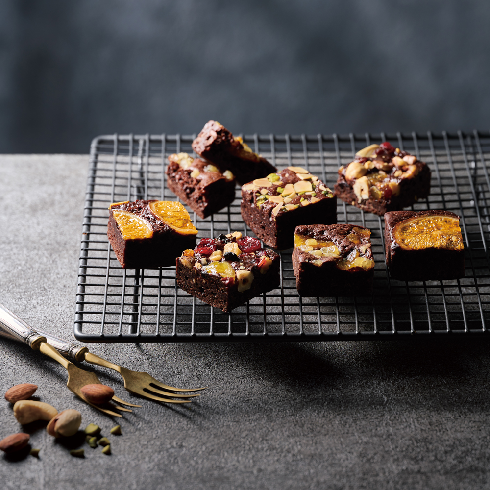 濃厚なチョコレートの生地に、香ばしいナッツや甘酸っぱいフルーツをトッピング。ピスタチオとアーモンド、ごろっとしたパイナップルやネーブル、たっぷりのドライフルーツとナッツ…。おいしさをぎゅっと詰め込んだキューブが、お口に小さなしあわせをお届けします。