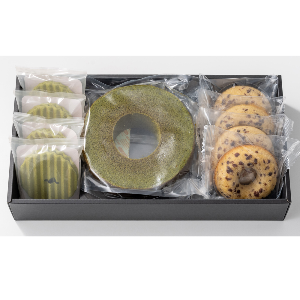 内容:宇治抹茶バウムクーヘン×1個、小豆ドーナツ×4個、ヴァッフェル×4個