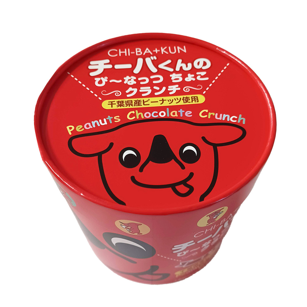 千葉県産のピーナッツを使用したチョコクランチです。赤いチーバくんの紙管箱がかわいく、おこさまにおすすめです。