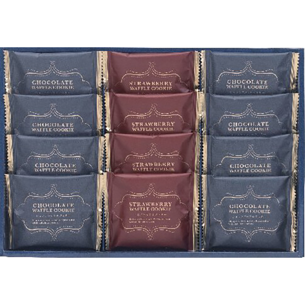 ホワイトチョコクリームを詰めた風味豊かなショコラワッフルクッキーといちごチョコクリームを詰めたいちごワッフルクッキーの詰合わせです。