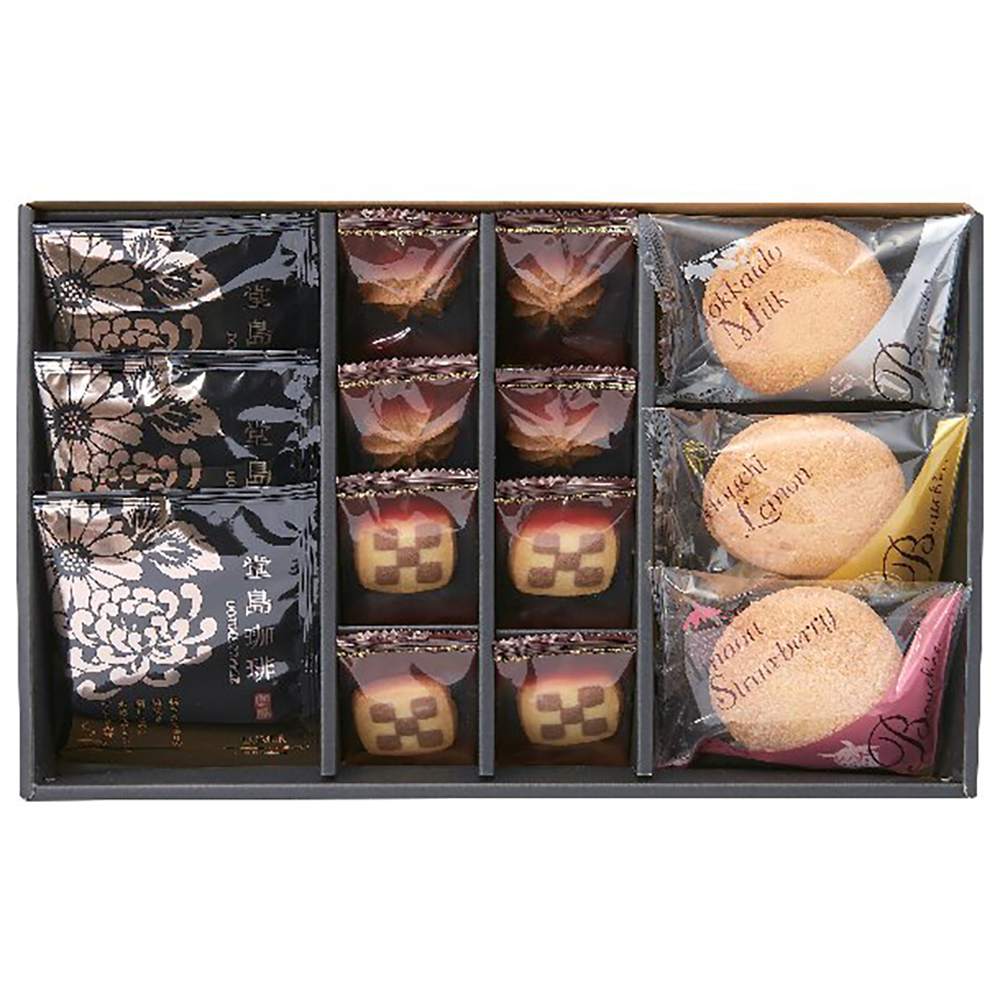 内容:堂島珈琲ドリップコーヒー×3、ブッセ(あまおう苺・瀬戸内レモン・北海道ミルク)×各1、チェスクッキー・コーヒークッキー×各4