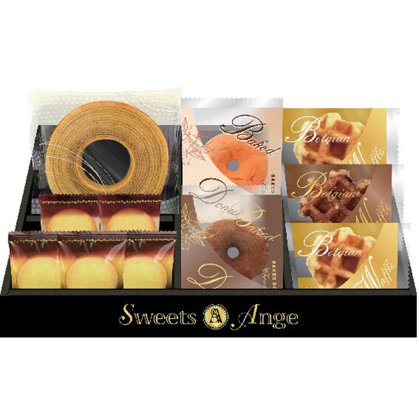 内容:ベルギーワッフル(プレーン)×2、ベルギーワッフル(ショコラ)・ミルクバウムクーヘン・ベイクドドーナツ(ストロベリー・ショコラ)×各1、プレーンクッキー×5