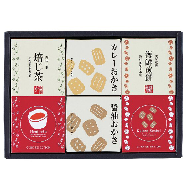 内容:静岡県産ほうじ茶60g、海鮮おかき20g、たまり醤油おかき・カレーおかき各24g