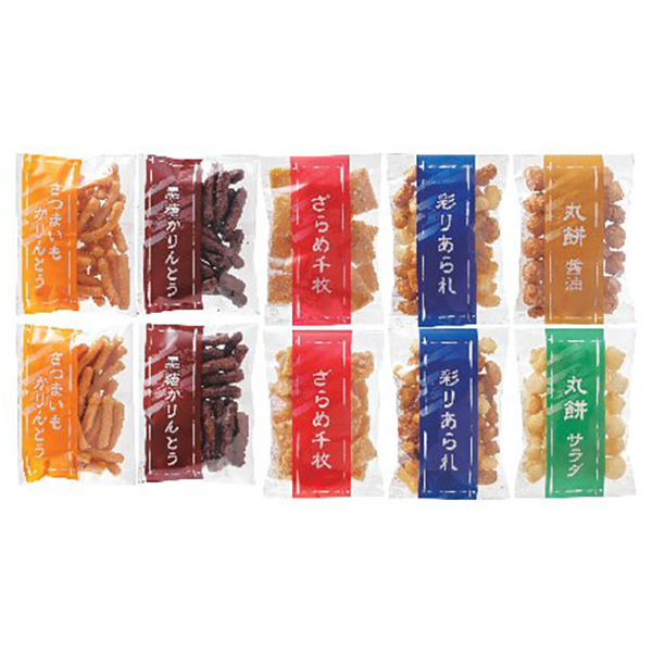 内容:かりんとう(さつまいも・黒糖)・ざらめ千枚・彩りあられ各40g×2、丸餅(醤油・サラダ)各40g