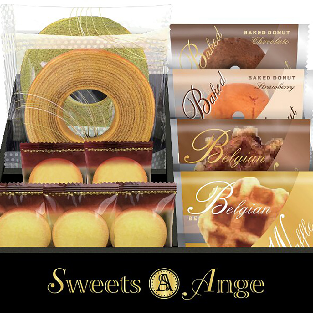 内容:ベルギーワッフル(プレーン・ショコラ)・ミルクバウムクーヘン・宇治抹茶バウムクーヘン・ベイクドドーナツ(ストロベリー・ショコラ)×各1、プレーンクッキー×5