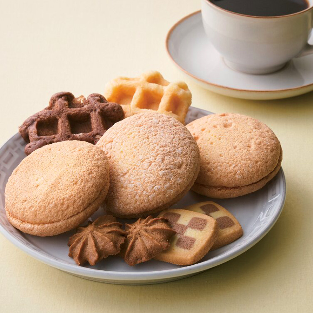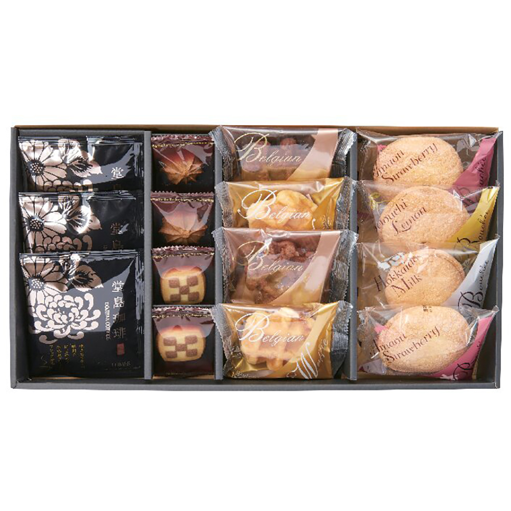 内容:堂島珈琲ドリップコーヒー×3、ブッセ(あまおう苺)×2、ブッセ(北海道ミルク・瀬戸内レモン)×各1、ベルギーワッフル(プレーン・ショコラ)・チェスクッキー・コーヒークッキー×各2