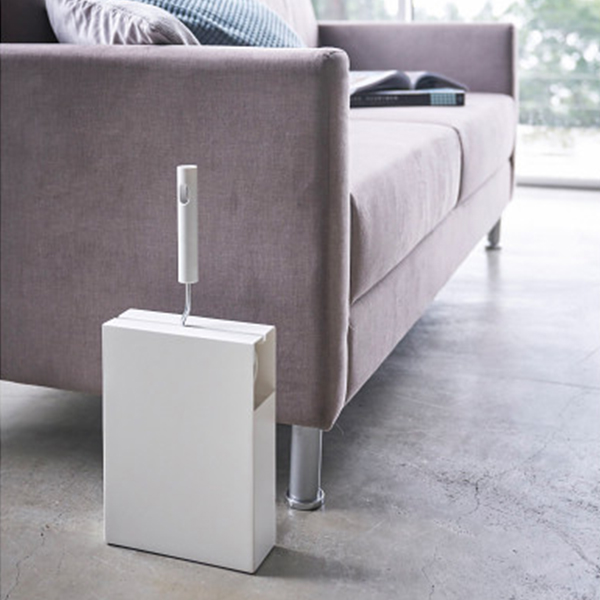 かくしてスタイリッシュに収納できるカーペットクリーナースタンド。横からスライドして入れるだけの簡単収納。左右どちらの方向からでも収納できます。下段にはスペアテープが3本入ります。