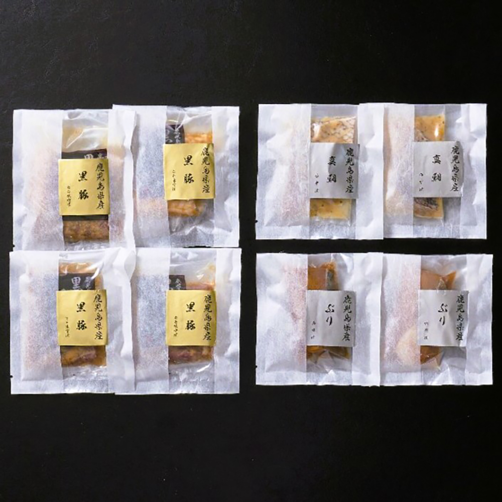 内容:黒豚モモ味噌漬80g×4、真鯛西京漬60g×2、ぶり幽庵漬70g×2
