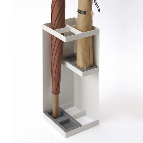 玄関の角にぴったりと収まるコンパクト角型かさたて。玄関で場所をとらない省スペースデザイン設計。トレイの位置を変えれば折り畳み傘も収納可能。