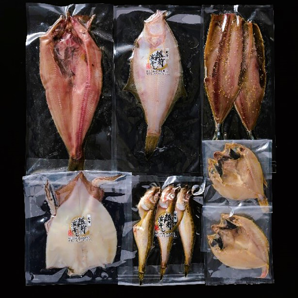 内容:開きほっけ200g、干し赤がれい170g、開きのどぐろ55g×2、干しはたはた100g(計3尾)、開きいか70g、さんま味醂干し150g(計2尾)