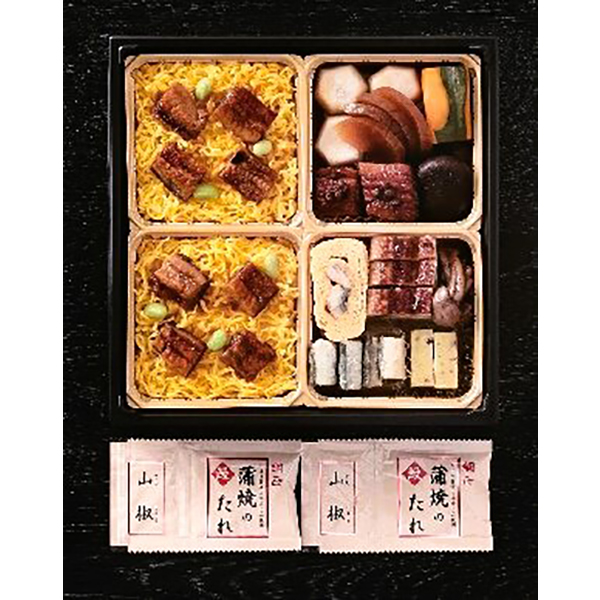 内容:鰻懐石重2人前(うなぎ錦糸ごはん140g×2、う巻2切、うなぎ短冊切り(塩麹焼き・西京漬け焼き各2切)、うなぎ山椒煮30g、うなぎ肝佃煮20g、うなぎ真丈3切、煮物(里芋・南瓜・椎茸各3)、奈良漬3切、丸十大納言2個、たれ・山椒×2)