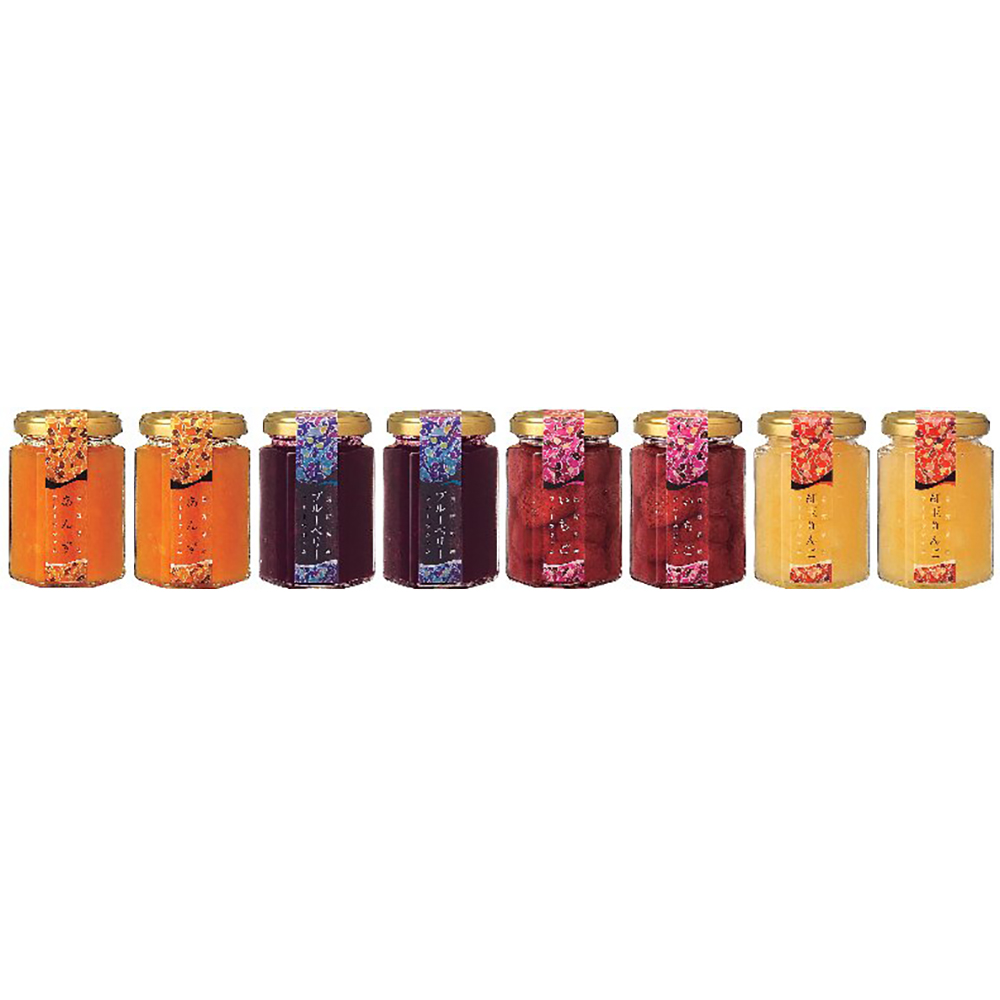 内容:フルーツジャム(あんず・ブルーベリー・いちご・紅玉りんご)145g×各2