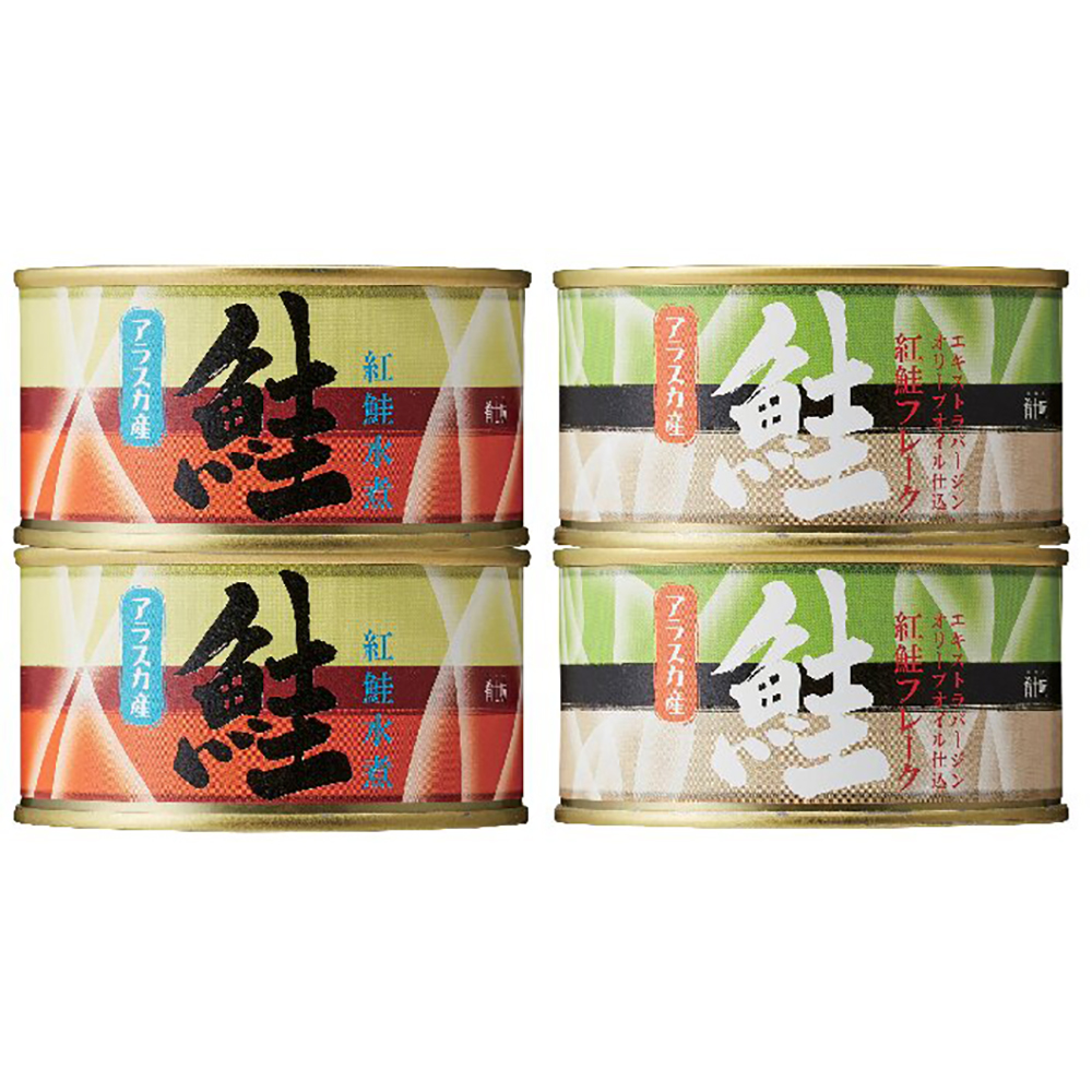 内容:アラスカ産紅鮭水煮・アラスカ産紅鮭フレークエキストラバージンオリーブオイル仕込各180g×2
