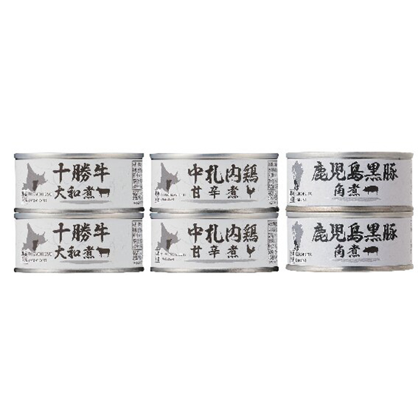 内容:十勝牛大和煮85g×2、鹿児島黒豚角煮・中札内鶏甘辛煮缶詰各80g×2