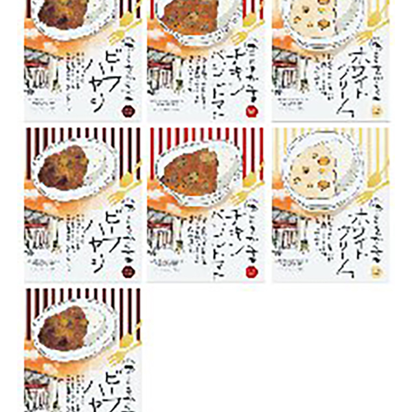 内容:ビーフハヤシ200g×3、チキンバジルトマト・ホワイトクリーム各200g×2