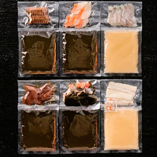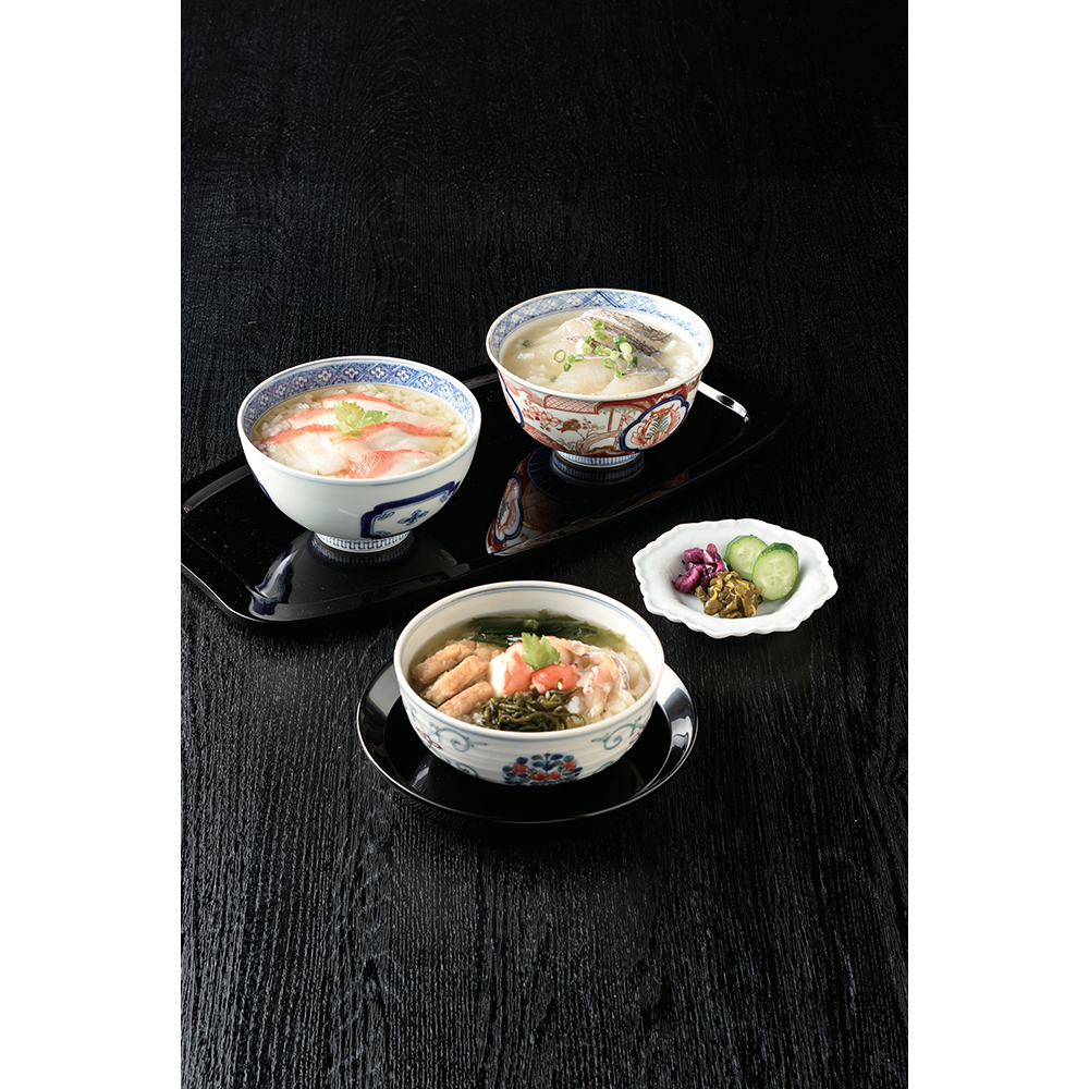 内容:鳴門鯛白みそ仕立て(鯛30g、出汁180g)、鰻鰹だし仕立て(うなぎ20g、出汁180g)、太刀魚胡麻風味仕立て(太刀魚15g、出汁180g、ごま)、鰹醤油仕立て(鰹30g、出汁180g)、炙り金目鯛茶漬け醤油仕立て(炙り金目鯛30g、出汁180g)、海鮮茶漬け鰹だし仕立て(鱧照焼き・えびむき身・鯛・湯通しひじき・湯通しわかめ計30g、出汁180g)