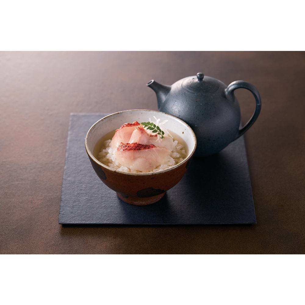 白みそ仕立ての「鳴門鯛」、鰻を鰹だしで食す「鰻鰹」、焼き上げた太刀魚を胡麻鰹だしで「太刀魚胡麻」、醤油漬けした鰹の「鰹醤油」、金目を炙った「炙り金目鯛」、天然の海藻、鯛、鱧、海老を使った「海鮮茶漬け」詰合わせ。国産魚介の贅沢茶漬けです。