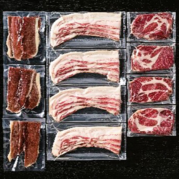 内容:肩ロース生ハムスライス60g×4、生ベーコンスライス90g×4、ポークジャーキー50g×3