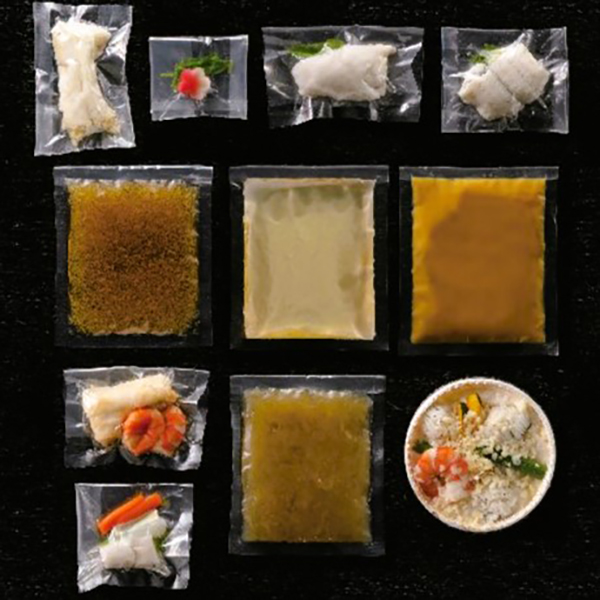 内容:鱧と生麩のみぞれ煮(鱧40g、梅麩・みつば、大根おろし入出汁135g)、鱧の吸い物(鱧40g(みつば入)、出汁140g)、鱧と鱧子の柳川鍋風(鱧40g(みつば入)、鱧子の柳川鍋風出汁(ごぼう入)150g)、鱧と海老のグラタン180g、鱧と海老の中華あんかけ(鱧と海老60g、湯通し野菜(小芋・筍・大根・みつば)20g、中華あん120g)