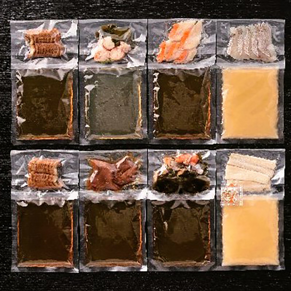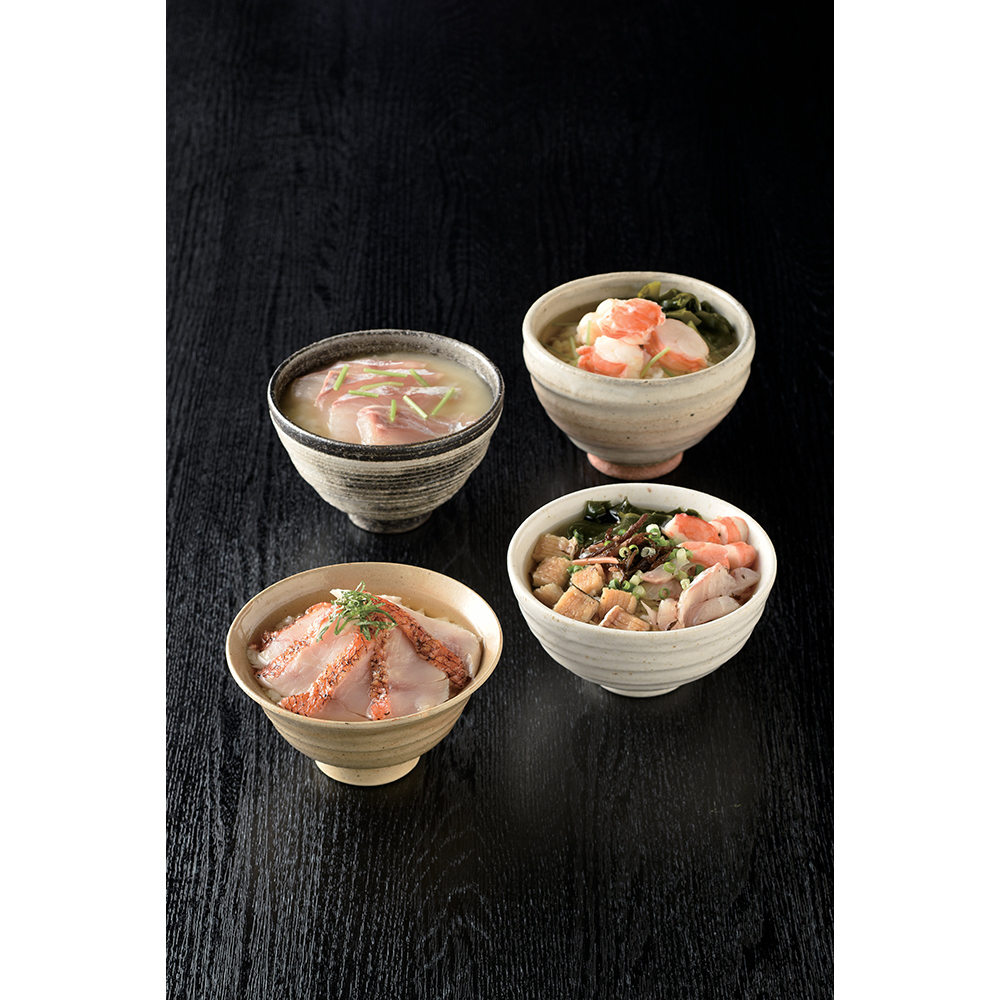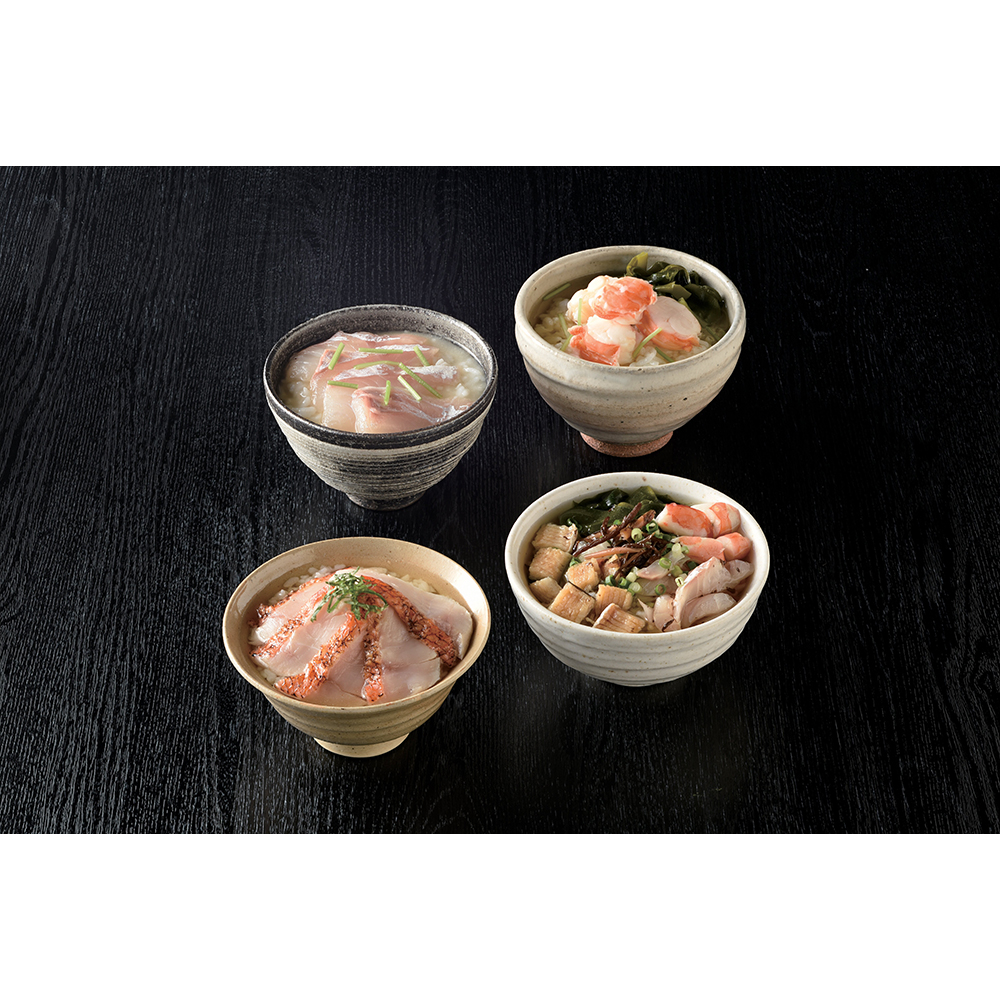 内容:鰻鰹だし仕立て(うなぎ20g、出汁180g)×2、鳴門鯛白みそ仕立て(鯛30g、出汁180g)、太刀魚胡麻風味仕立て(太刀魚15g、出汁180g、ごま)、鰹醤油仕立て(鰹30g、出汁180g)、伊勢海老スープわかめ仕立て(伊勢海老25g(湯通しわかめ、みつば入)、出汁180g)、炙り金目鯛茶漬け醤油仕立て(炙り金目鯛30g、出汁180g)、海鮮茶漬け鰹だし仕立て(鱧照焼き・えびむき身・鯛・湯通しひじき・湯通しわかめ計30g、出汁180g)