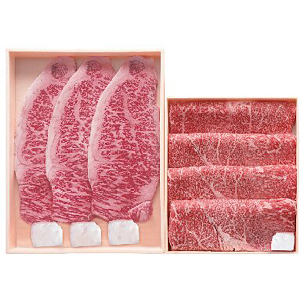 内容:ロース肉(ステーキ用)150g×3、モモ肉(すき焼き用)380g
