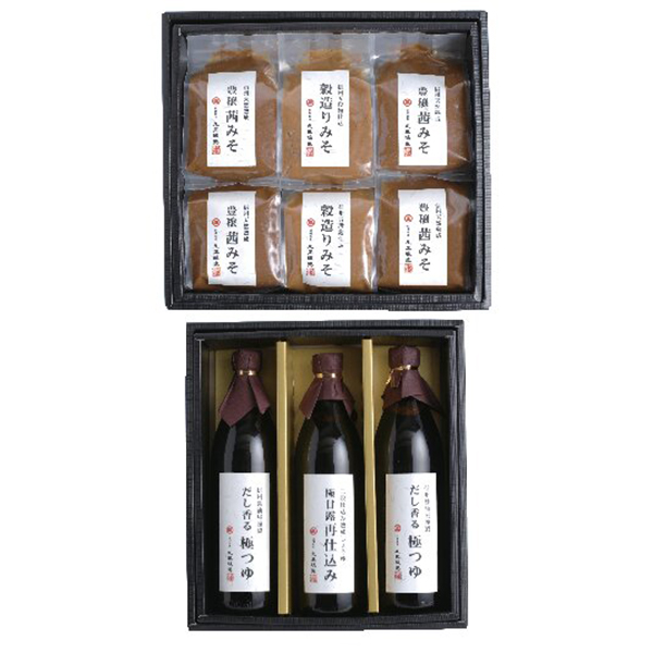 内容:豊穣茜みそ750g×4、穀造りみそ750g×2、だし香る極つゆ900ml×2、極甘露再仕込醤油900ml