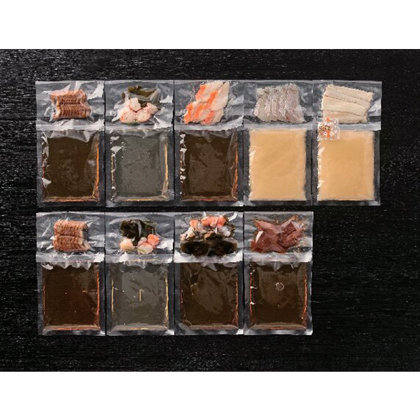 内容:鰻鰹だし仕立て(鰹30g、出汁180g)×2、伊勢海老スープわかめ仕立て(伊勢海老25g(湯通しわかめ・みつば入)、出汁180g)×2、鳴門鯛白みそ仕立て(鯛30g、出汁180g)、太刀魚胡麻風味仕立て(太刀魚15g、出汁180g、ごま)、鰹醤油仕立て(鰹30g、出汁180g)、炙り金目鯛茶漬け醤油仕立て(炙り金目鯛30g、出汁180g)、海鮮茶漬け鰹だし仕立て(鱧照焼き・えびむき身・鯛・湯通しひじき・湯通しわかめ計30g、出汁180g)