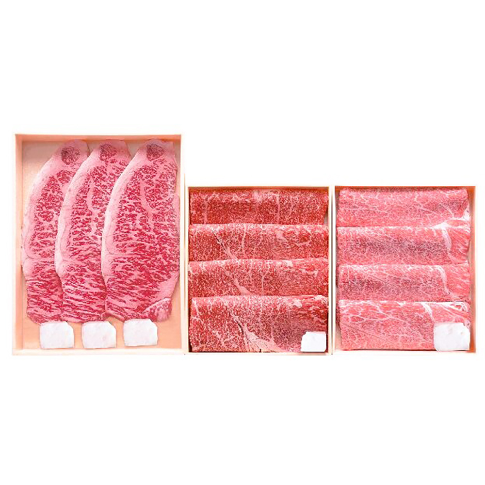 内容:ロース肉(ステーキ用)150g×3、モモ肉(すき焼き用)380g、肩肉(すき焼き用)330g