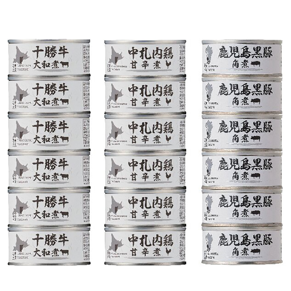 内容:十勝牛大和煮85g×6、鹿児島黒豚角煮・中札内鶏甘辛煮缶詰各80g×6