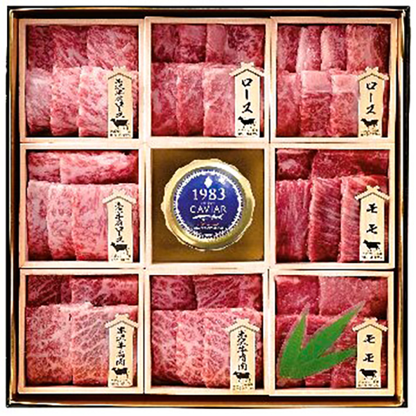 内容:米沢牛肩ロース肉・肩肉各80g×2、鹿児島黒牛ロース肉・モモ肉各80g×2、国産キャビア20g