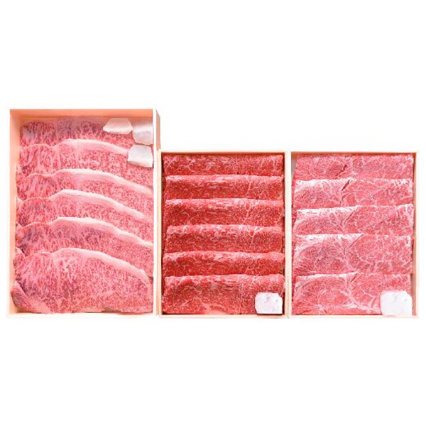 内容:ロース肉(ステーキ用)180g×6、モモ肉(すき焼き用)570g、肩肉(すき焼き用)470g