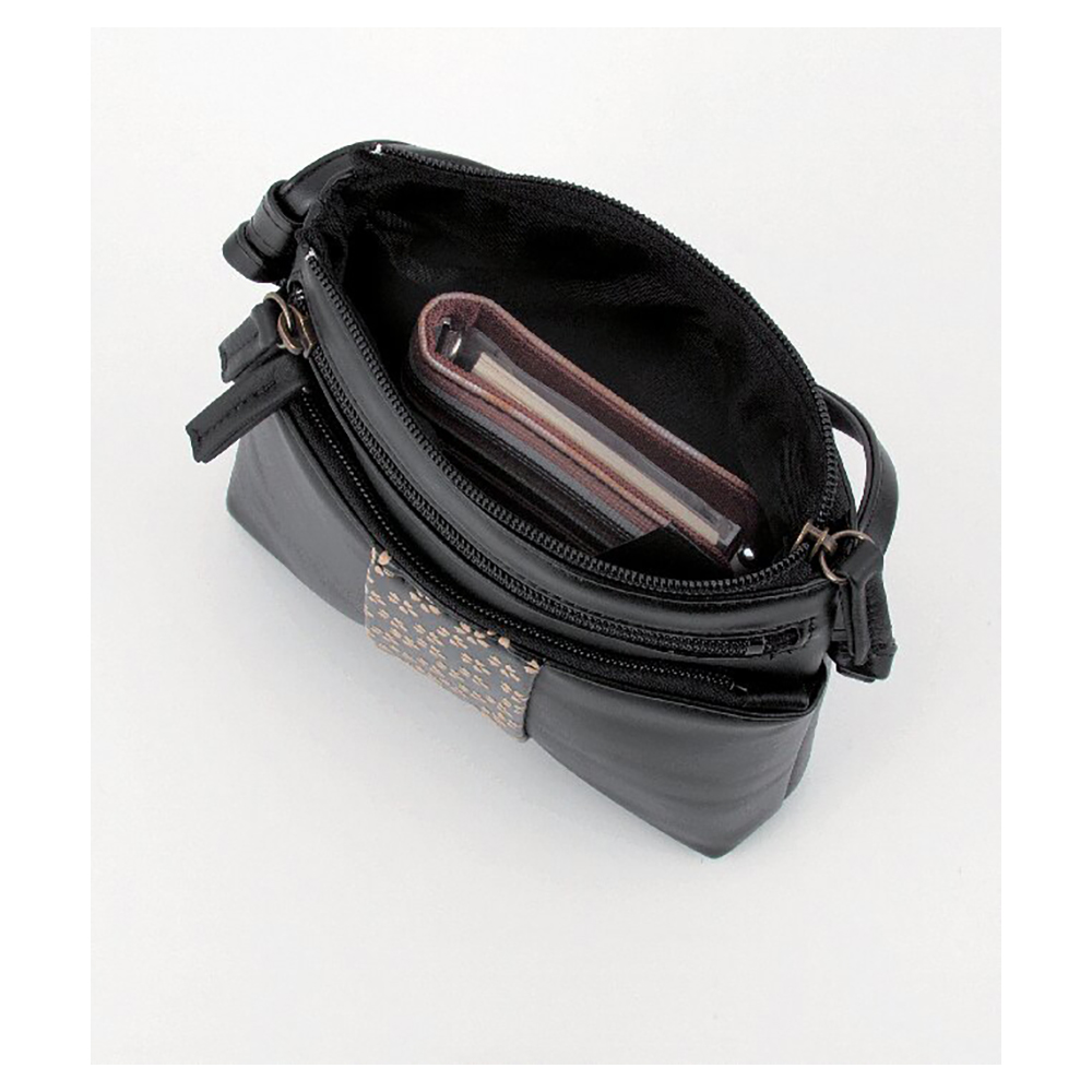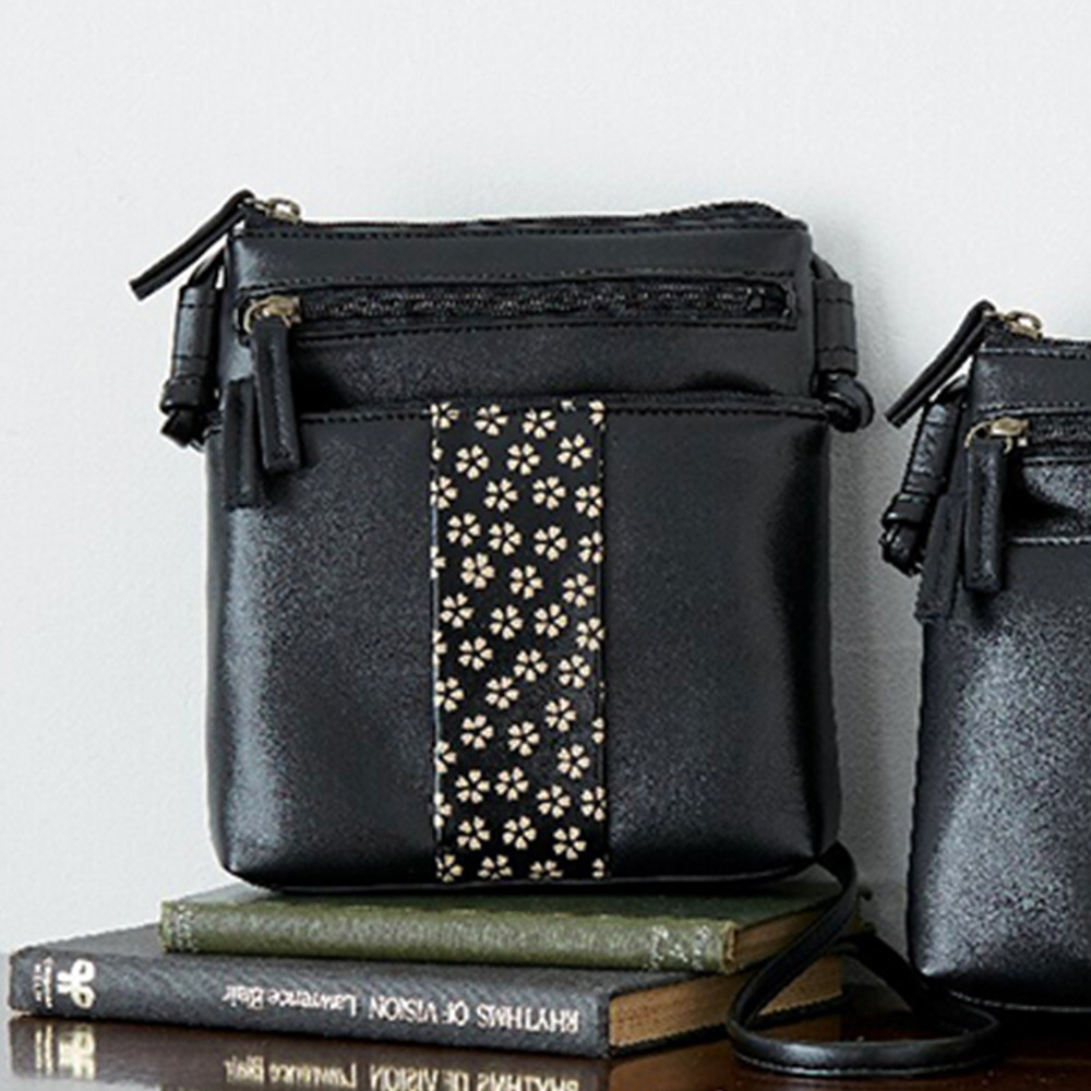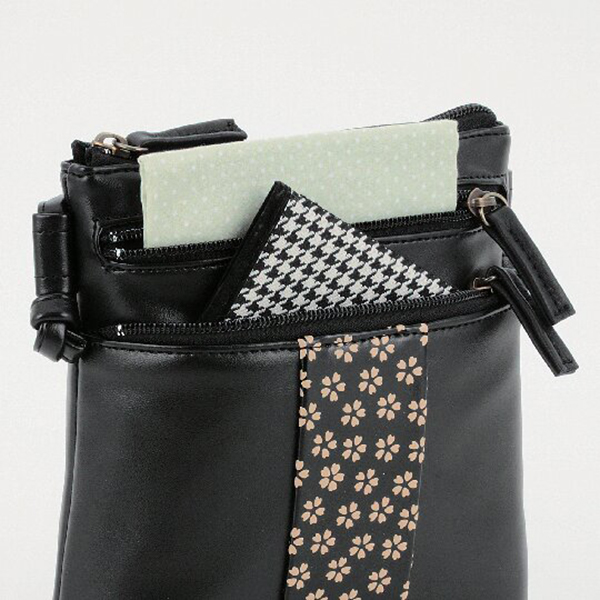 開口部:ファスナー式、外部:ファスナーポケット2、ショルダーベルト着脱不可(長さ調節不可)。軽くて持ちやすいポシェット形状に、ポイントに京友禅加工で桜を描いたデザイン。京都のバッグ工房「京都新装」で丁寧に作られるポシェットです。