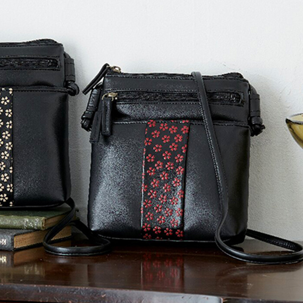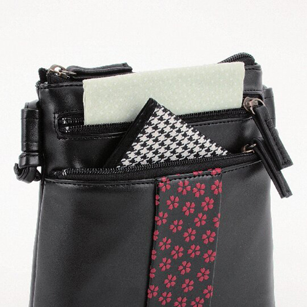 開口部:ファスナー式、外部:ファスナーポケット2、ショルダーベルト着脱不可(長さ調節不可)。軽くて持ちやすいポシェット形状に、ポイントに京友禅加工で桜を描いたデザイン。京都のバッグ工房「京都新装」で丁寧に作られるポシェットです。