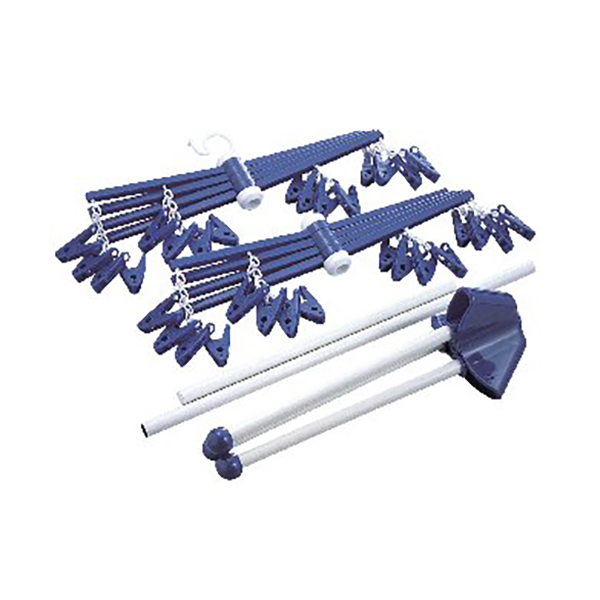 総耐荷重約7Kg、お客様組立品。コンパクトサイズながら32ピンチ付きでたくさん干せます。また上部分のハンガーにはフックが付いているのでポールから取り外してロープや竿に掛けて使う事もできます。