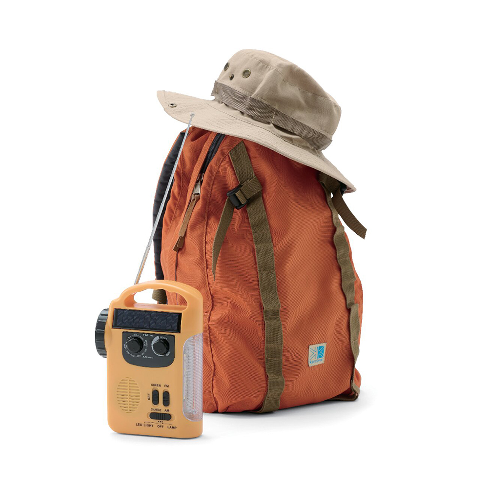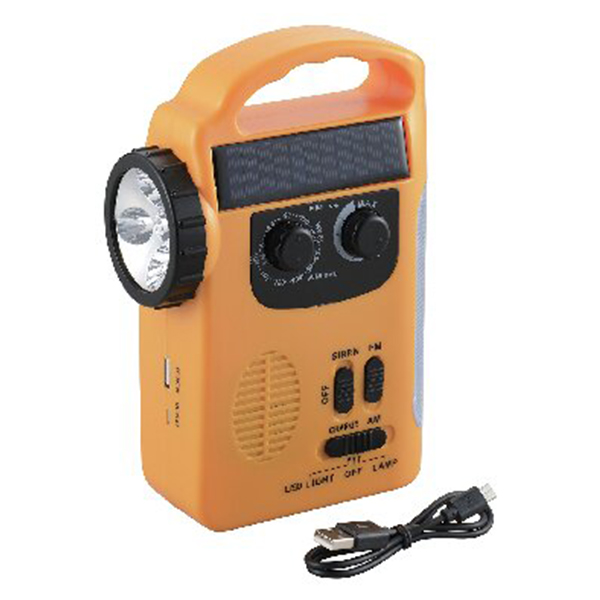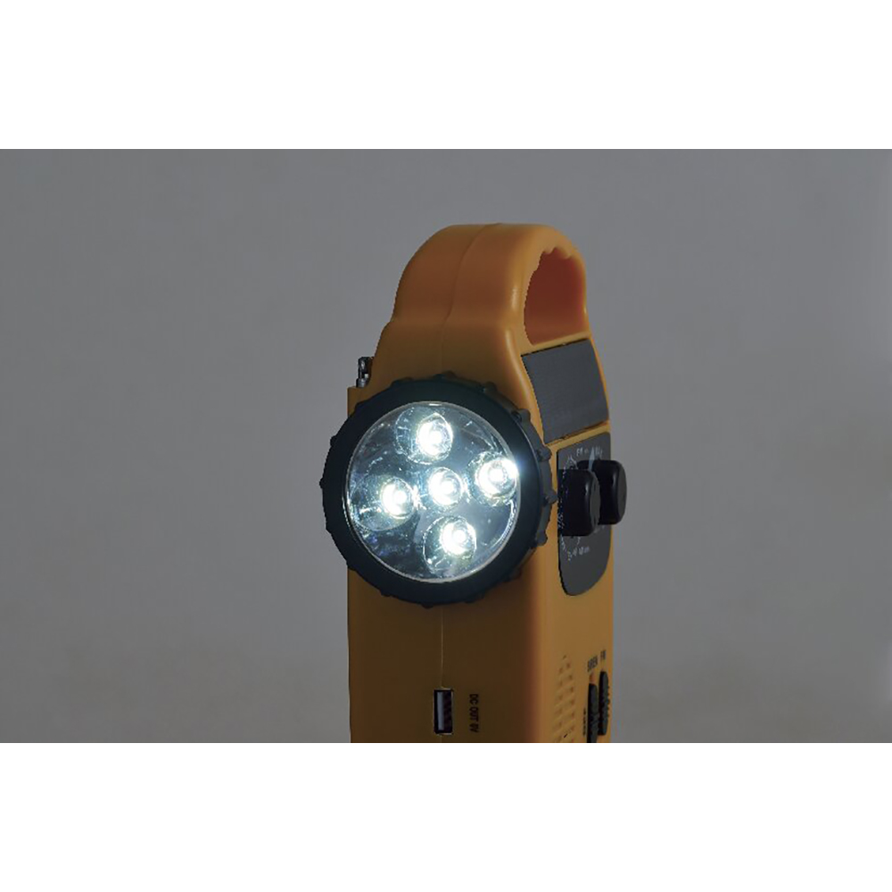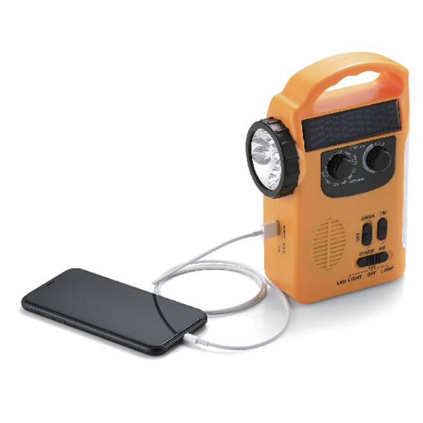 電源:充電式又は単3乾電池×3(別売)。ソーラー・手回し・USB充電の3WAY。AM・FMラジオ受信。