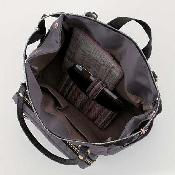 開口部:ファスナー式、外部:オープンポケット2・ファスナーポケット2、内部:オープンポケット2・ファスナーポケット1。普段使いのリュックとして。またベルトを後面の収納ポケットに入れて肩掛けや手提げとしてもご使用できます。