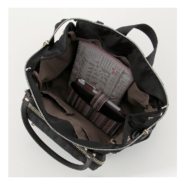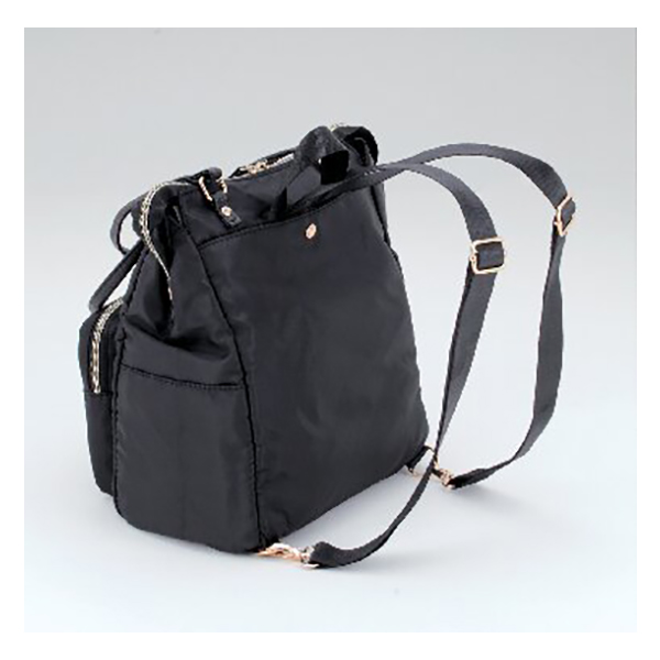 開口部:ファスナー式、外部:オープンポケット2・ファスナーポケット2、内部:オープンポケット2・ファスナーポケット1。普段使いのリュックとして。またベルトを後面の収納ポケットに入れて肩掛けや手提げとしてもご使用できます。