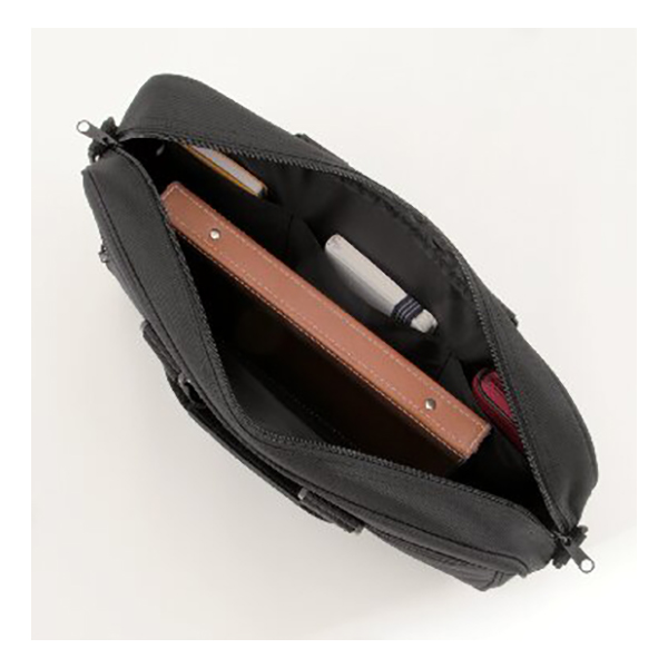 B4ファイルサイズ対応。開口部:ファスナー式、外部:ファスナーポケット1・面ファスナー式ポケット1、内部:オープンポケット3、ショルダーベルト付(着脱可・長さ調節可)。B4ファイル収納可能なスタイリッシュビジネスバッグ。メイン収納は3つのオープンポケットで分別収納が可能。シーンに合わせて斜め掛けもできる着脱式ショルダーベルト付きで手提げとショルダーの2WAYで使用が可能です。